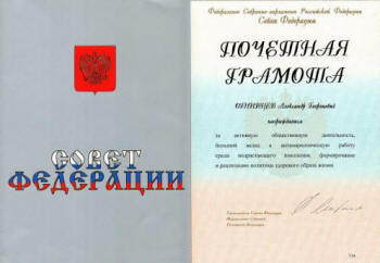 Почетная грамота №714 подписана Председателем Совета Федерации Федерального Собрания Российской Федерации С.М.Мироновым. Председатель НСНБР А.Г.Огнивцев был награжден в Совете Федерации 18 декабря 2003 года.